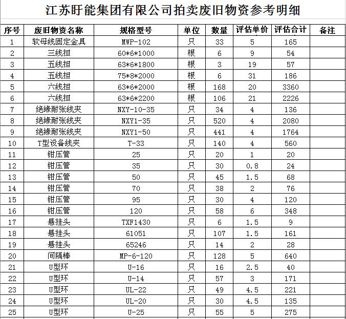 關(guān)注微信公眾號受江蘇盱能集團(tuán)有限公司委托,我公司將通過中國拍賣行業(yè)協(xié)會網(wǎng)絡(luò)拍賣平臺以網(wǎng)絡(luò)競價的方式公開拍賣廢舊物資一批,主要包括:電纜、金具、線管、開關(guān)等(詳見拍品目錄)。
