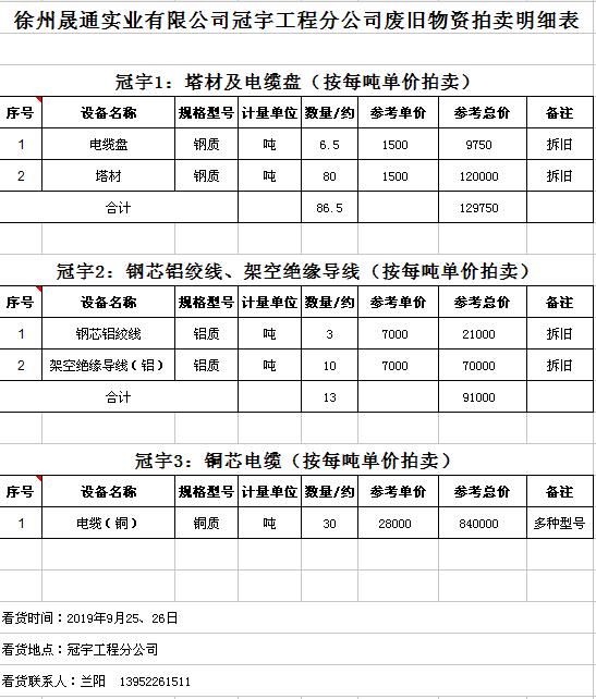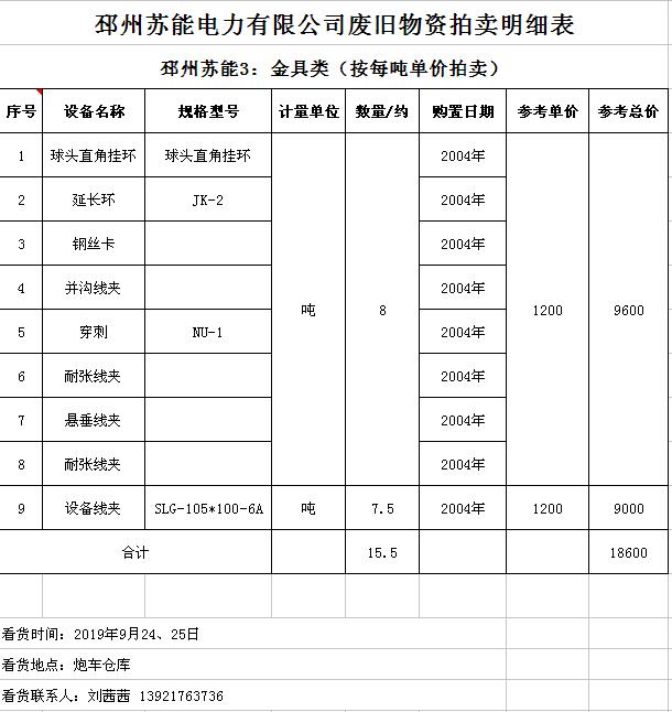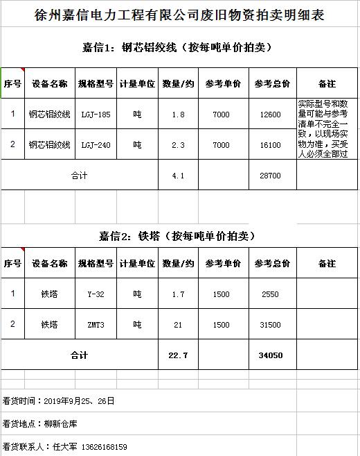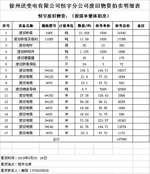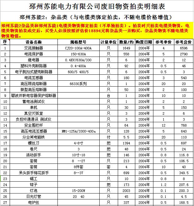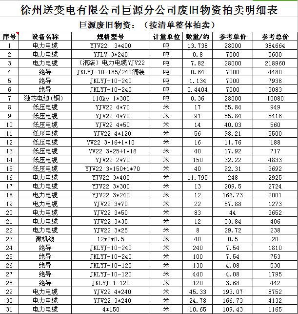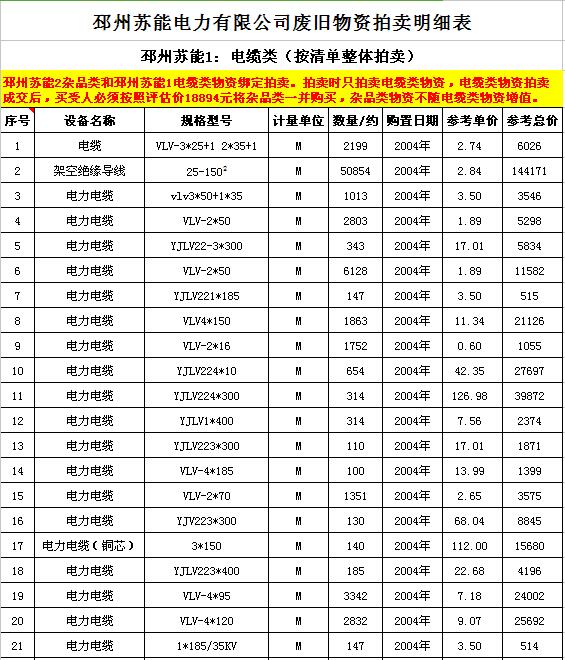 關(guān)注微信公眾號(hào)受委托,我公司將通過(guò)中國(guó)拍賣(mài)行業(yè)協(xié)會(huì)網(wǎng)絡(luò)拍賣(mài)平臺(tái)以網(wǎng)絡(luò)競(jìng)價(jià)的方式公開(kāi)拍賣(mài)廢舊電力物資一批,主要包括:電纜、導(dǎo)線(xiàn)、廢舊鋼材、鋼芯鋁絞線(xiàn)、金具、雜品、機(jī)具、空調(diào)、辦公設(shè)備等。