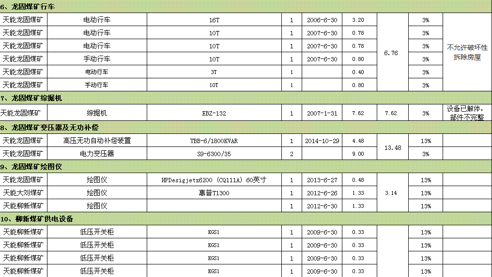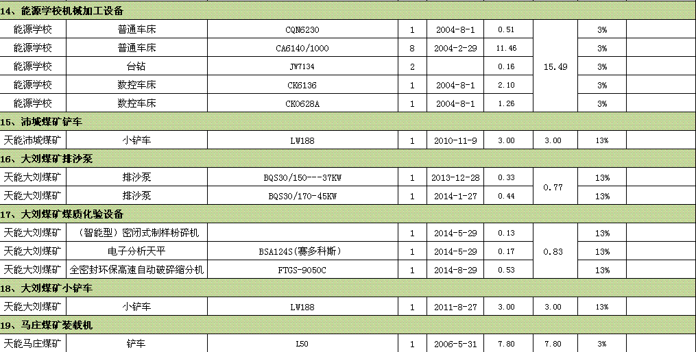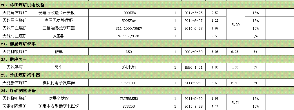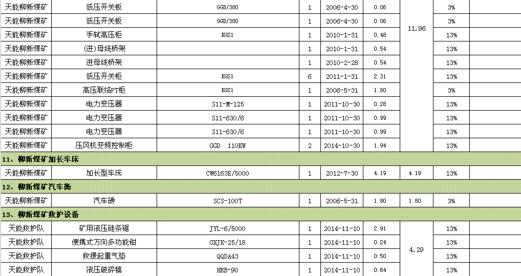 裝載機(jī)、鉆床、車床、提升機(jī)、壓風(fēng)機(jī)、行車、綜掘機(jī)、變壓器、開關(guān)柜、鏟車汽車衡、測量設(shè)備等。