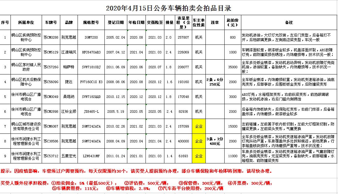 關(guān)注微信公眾號(hào)受委托,我公司定于2020年4月15日13:30時(shí)在徐州市銀地二手車交易市場四樓東南拍賣大廳通過現(xiàn)場和汽車街網(wǎng)絡(luò)拍賣平臺(tái)同步進(jìn)行的方式公開拍賣以下車輛:①05年蘇CM0288君越;②07年蘇CM5129江淮瑞風(fēng);③11年蘇C5726G帕薩特;④10年蘇CM6067君越;⑤08年蘇C38586君越;⑥11年蘇C53712五菱宏光;⑦08年蘇C5609G捷達(dá);⑧10年蘇CM0049桑塔納;⑨05年蘇CM2898江鈴全順。