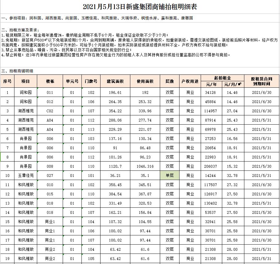 關注微信公眾號我公司受委托,定于2021年5月13日9:30時在徐州市中山南路55號本公司拍賣廳公開拍租以下商鋪:湖西雅苑14間、嘉和雅苑3間、尚景園11間、玉潭佳苑4間、紫荊園2間、康馨園3間、楓情水岸2間、潤和園3間、天瑞華府1間、和風雅致21間。面積分別約為數(shù)十至三百余平米不等,租期均為三年。